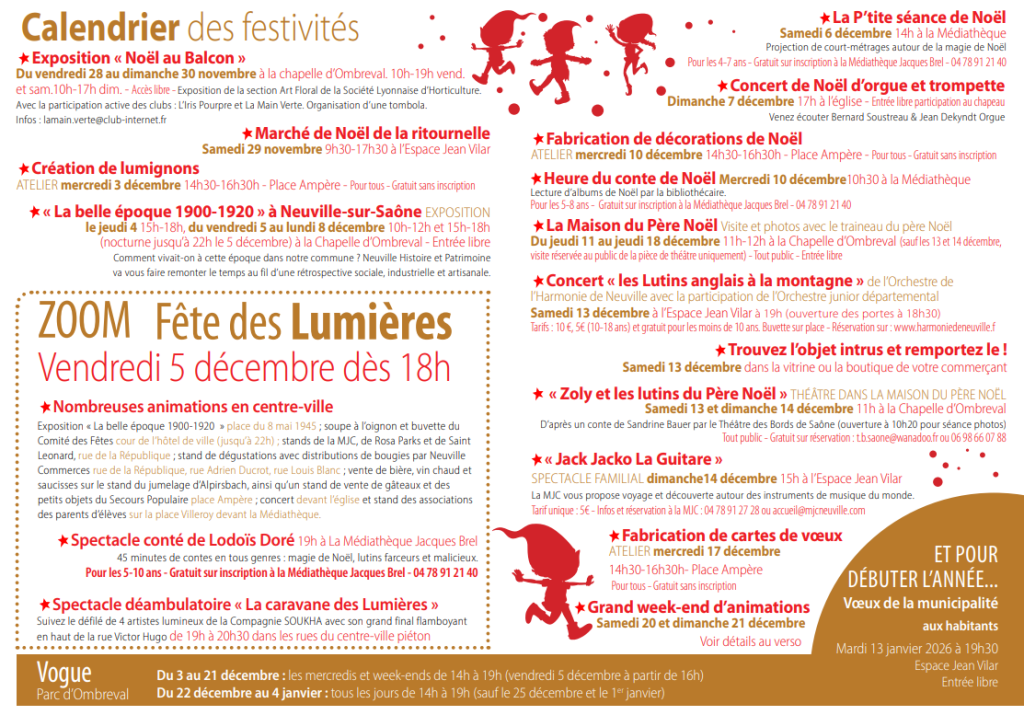 Profitez des Fêtes de fin d’année à Neuville-sur-Saône, retrouvez le programme complet de notre ville sur le thème Le Noël des lutins.